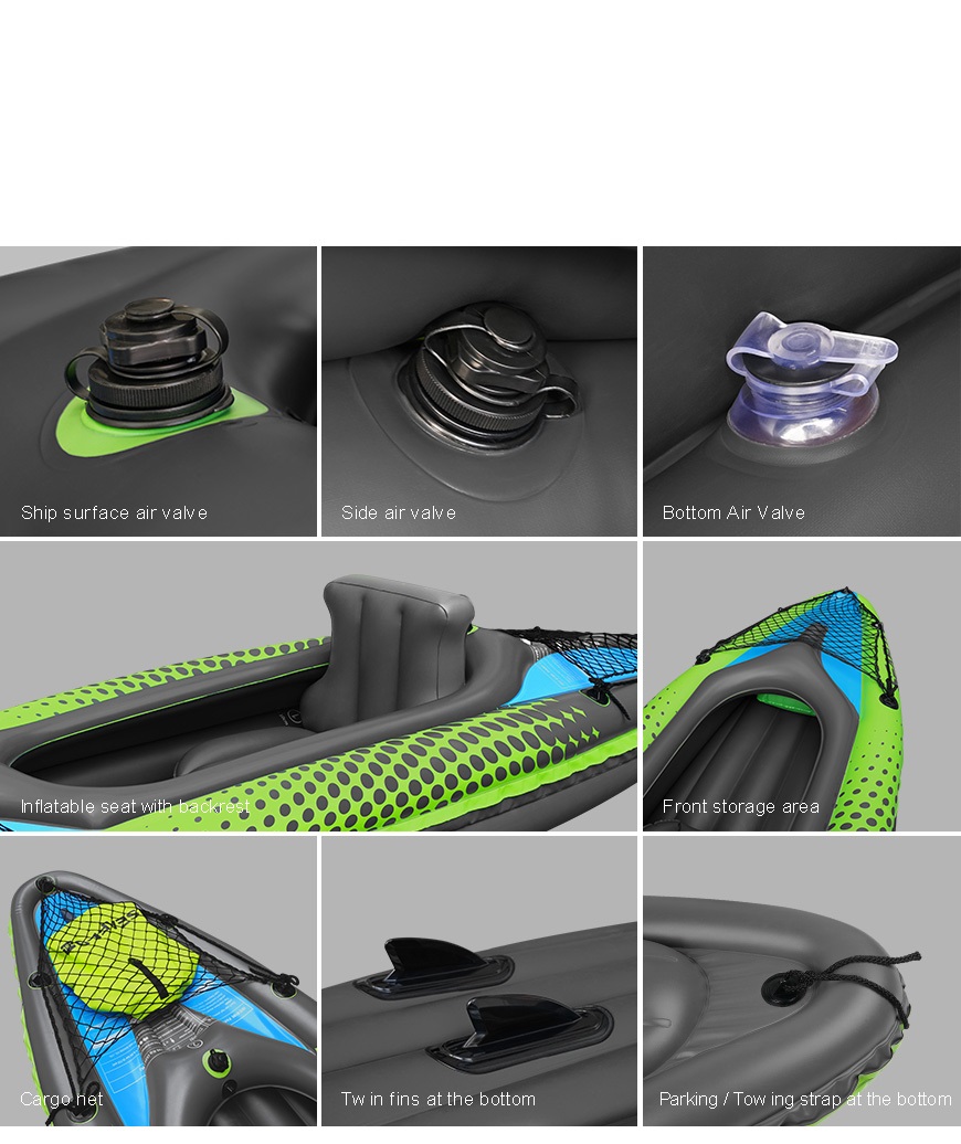 This kayak is perfect for one adult to paddling in the lakes and mild rivers. Its lightweight, compact and very easy to assemble, which could be inflatable and deflatable in minutes. You can take the fun of kayaking wherever you go. This kayak also embraces a multitude of great features including an adjustable, inflatable seat with a backrest for comfortable seating. A grab line and a cargo net at each end provided for your convenience, as well as extra storage.